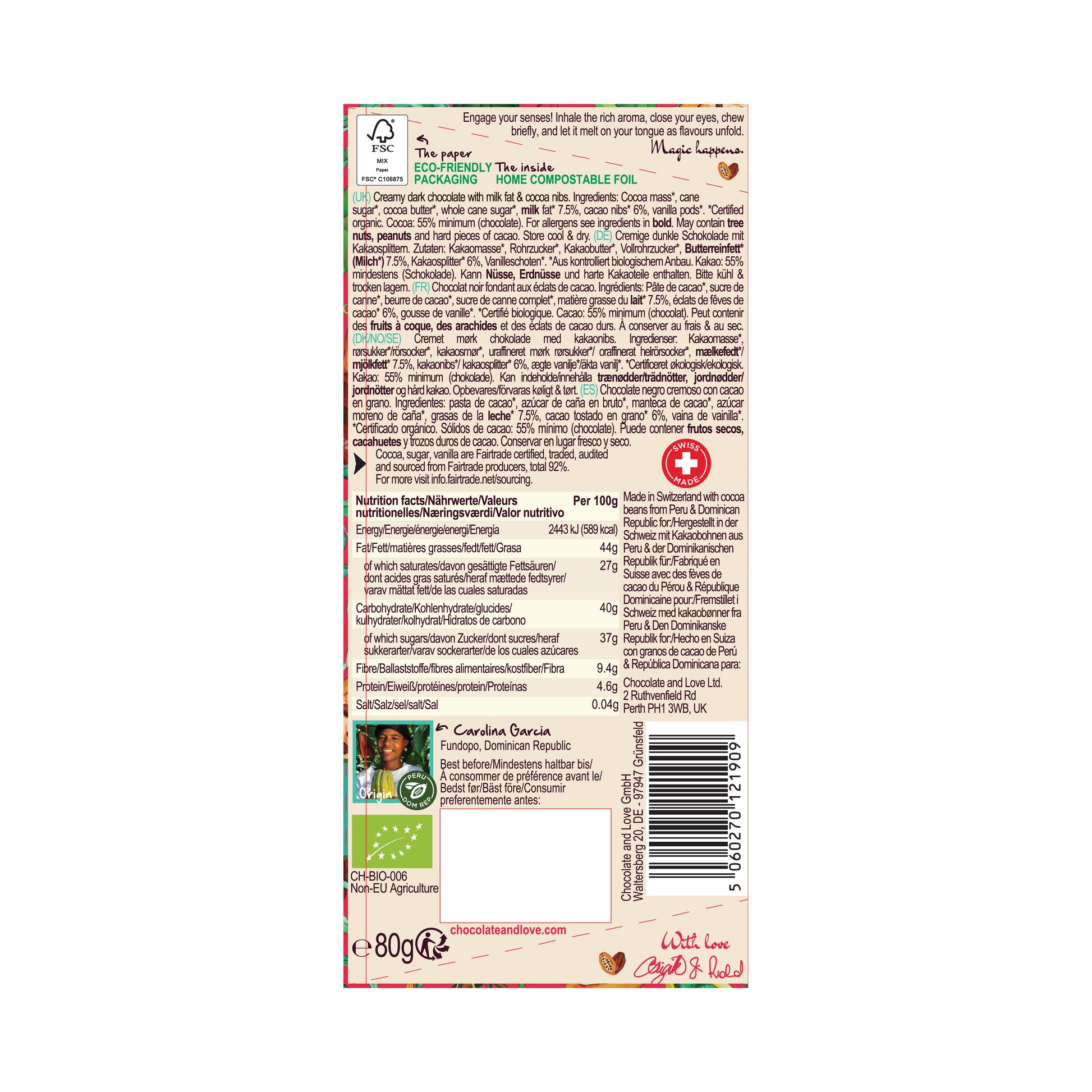 Cocoa mass*, cane sugar*, cocoa butter*, whole cane sugar*, MILK fat* 7.5%, cacao nibs* 6% and vanilla pods*. *Certified organic. Cocoa, sugar, vanilla: traded in compliance with Fairtrade Standards, total 92%. Visit www.info.fairtrade.net. Cocoa: 55% minimum (chocolate).