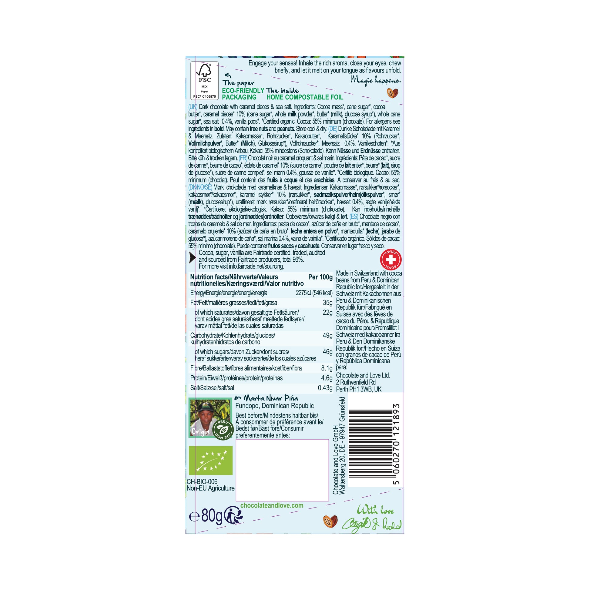 Cocoa mass*, cane sugar*, cocoa butter*, caramel pieces* 10% (cane sugar*, whole milk powder*, butter*, glucose syrup*), whole cane sugar*, sea salt, vanilla pods*. *Certified organic. Cocoa, sugar, vanilla: traded in compliance with Fairtrade Standards, total 96%. Visit www.info.fairtrade.net. Cocoa: 55% minimum (chocolate).